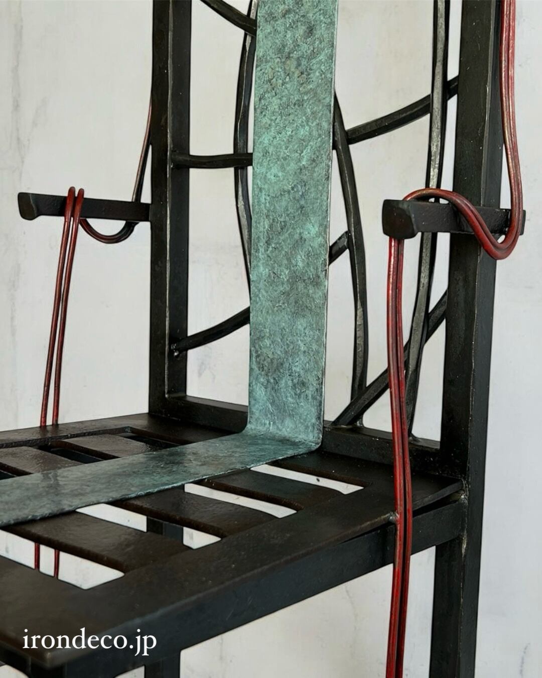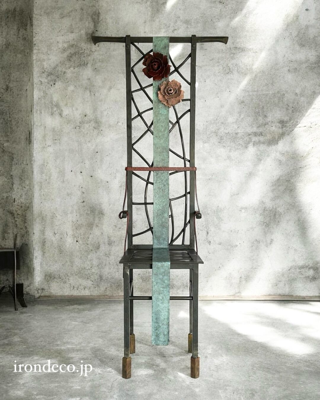 背もたれの鉄の曲線は、蔓が伸びるように広がり、